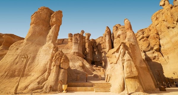 Picturesque valley in the Hijaz Mountains known for its monumental rock formations, palm oases, and ancient ruins.